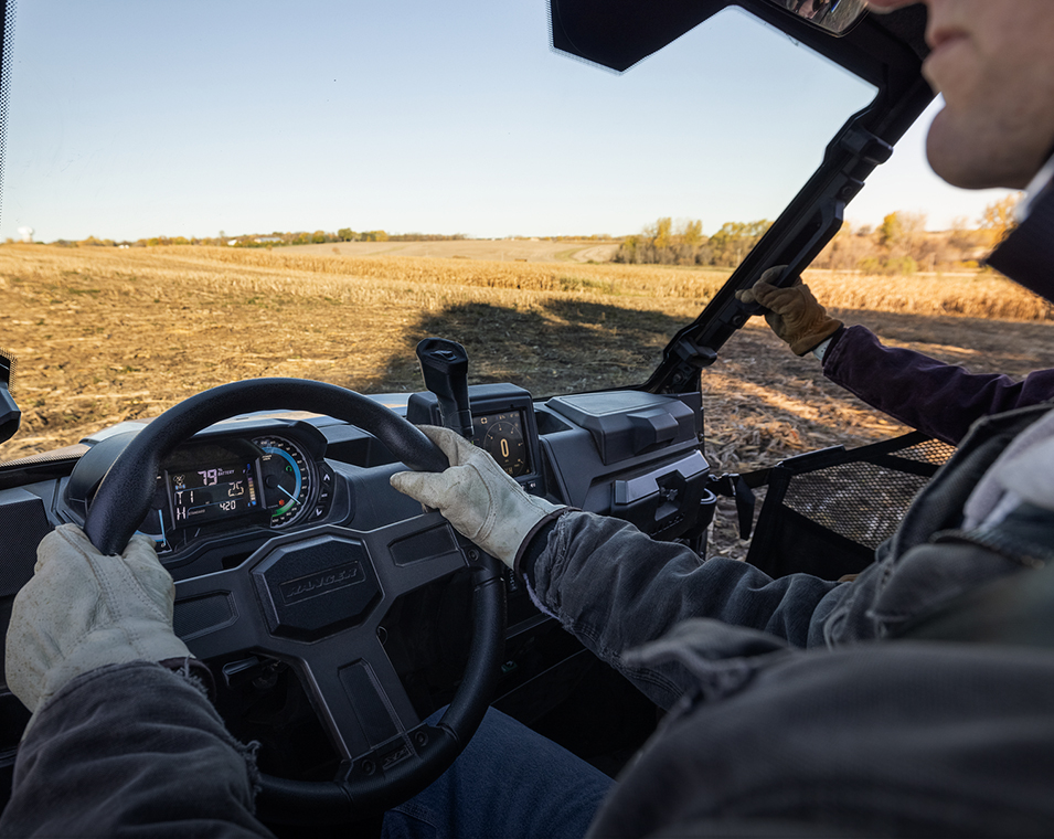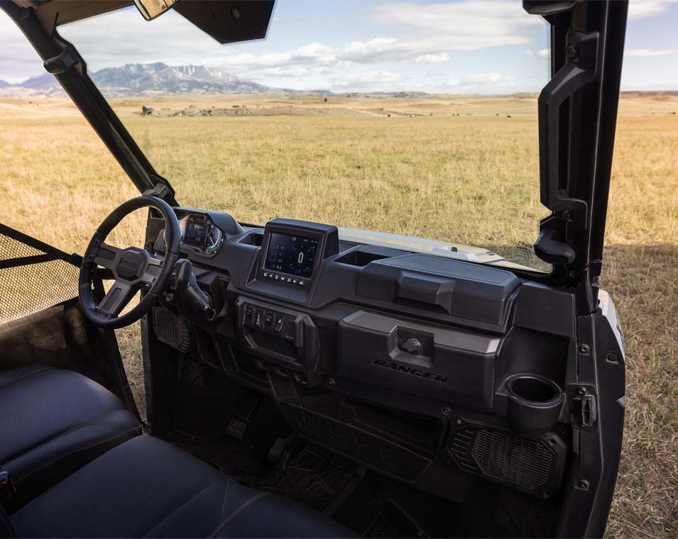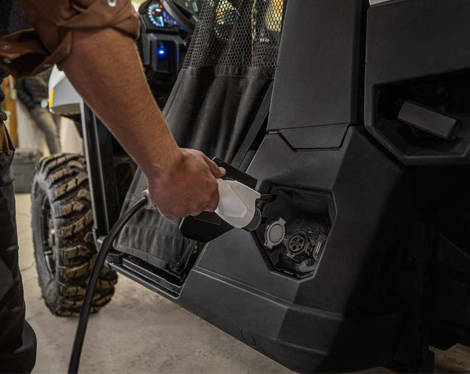 - Center Mounted 7" Glove Touch Display with EV Infotainment (includes Range Remaining, Battery State of Charge, Charging Status, Launch Indicator, System Diagnostics and more), Speed Limiting, Plow Mode, Group Ride, GPS Navigation, Air Temp., Bluetooth, AM/FM Radio, Driver's Side Dual-sweep Analog Dials w/ 4" Multi-Color LCD Rider Information Center: Power Use and Regen %, Battery State of Charge %, Range Remaining, Charging Rate, Battery Temperature, Motor Temperature, Accessory Voltage, Speedometer, Odometer, Tripmeter, Gear Indicator, Service Indicator and Codes, Programmable Service Intervals, Seat Belt Reminder, User Selectable Backlighting & Brightness, Clock, Premium Cut & Sew Seats with Contoured Seatbacks and Embroidered Polaris Branding, Premium Steering Wheel and Interior Accents, Polaris Pulse Electrical System (6 position), DC Outlet, Dual USB Port, Cargo Box Located 12V SAE Port with In-Dash On/Off Switch, In Dash Speakers, Rear Camera, *Connectivity with Ride Command + App